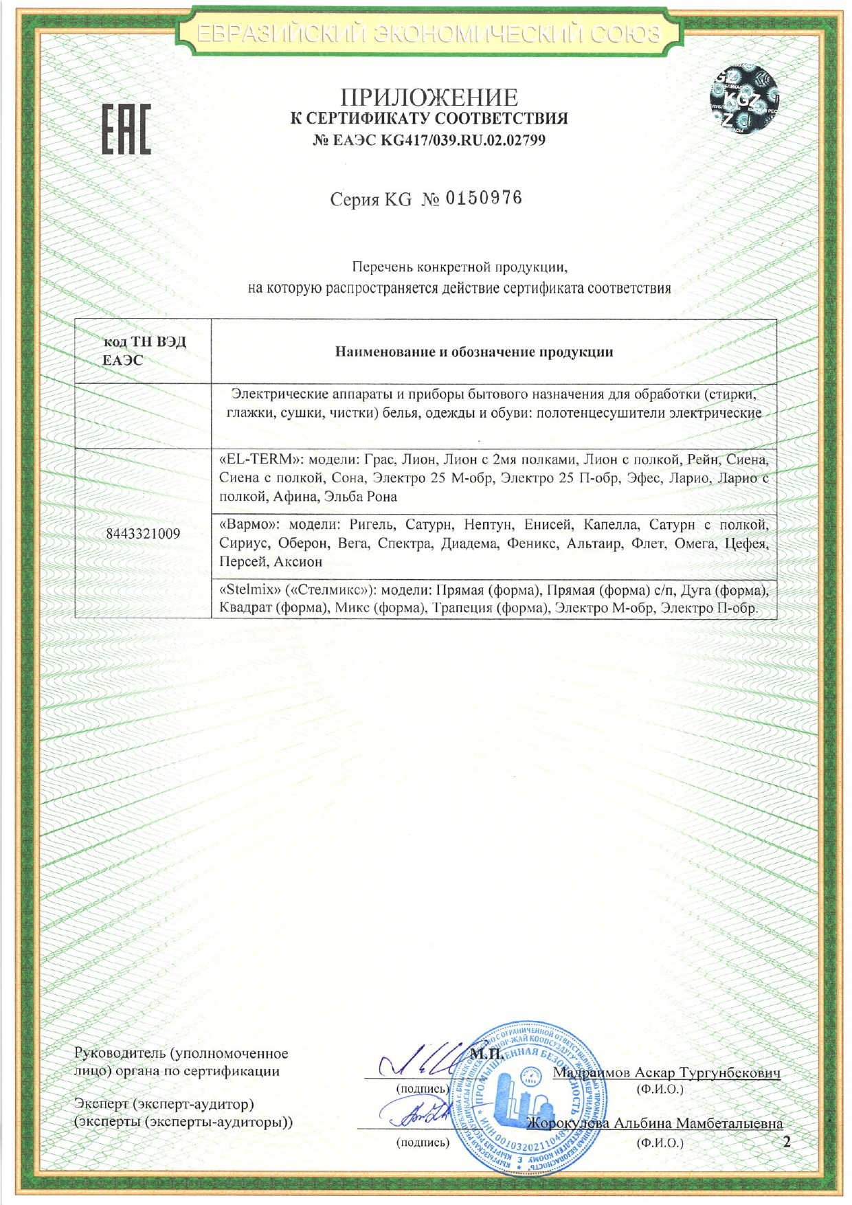 Сертификат соответствия: № ЕАЭС КС417/039.1Ш.02.02799